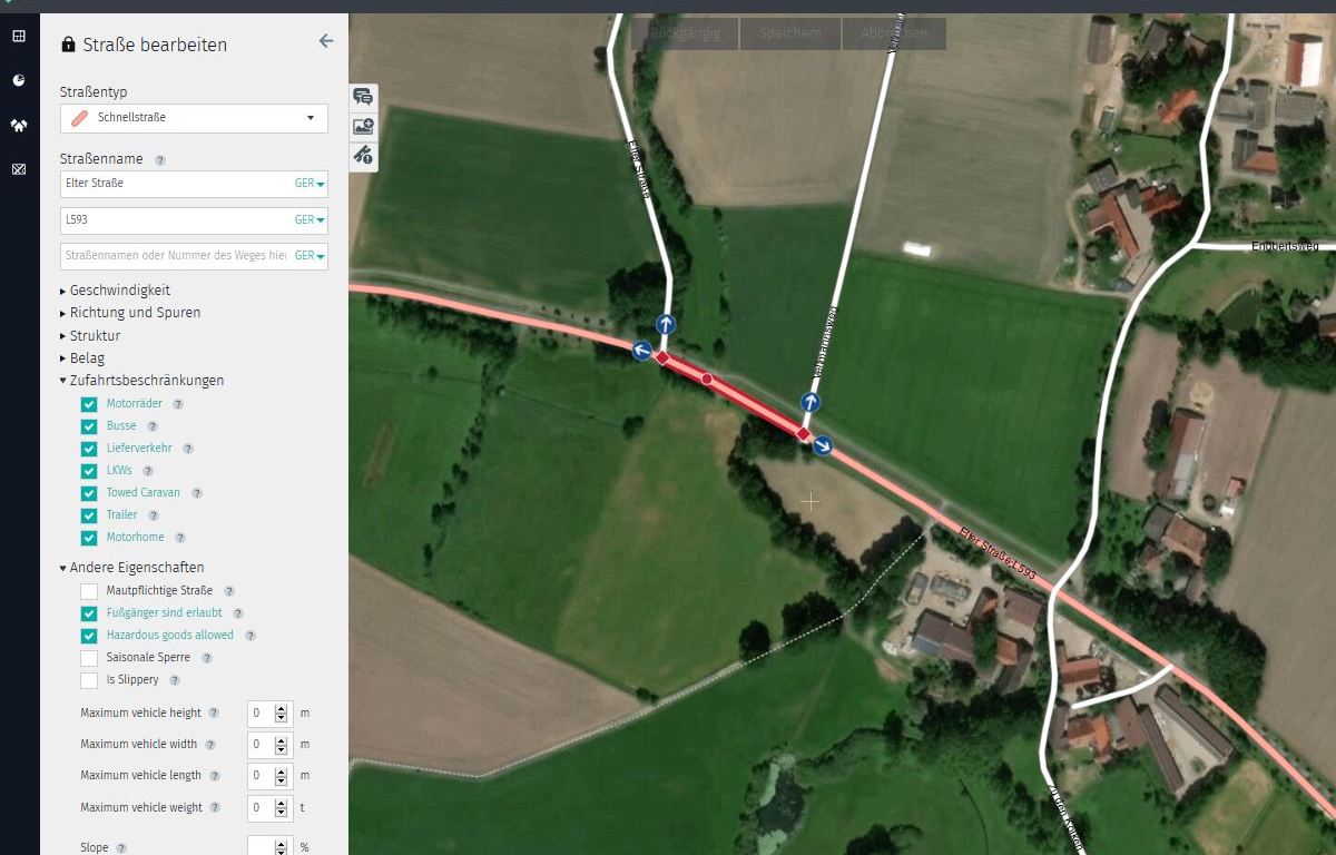 Zudem können wir nun unter den „Anderen Eigenschaften“ bestimmte LKW-Restriktionen wie maximale Höhe, Breite, Länge und Gewicht (height, width, length, weight) in Metern bzw. Tonnen eingeben. Auch die %-Angabe bei Steigungen/Gefälle (Slope) ist jetzt möglich. Für Steigungen z.B. „+4%“, bei Gefälle „-4%“.