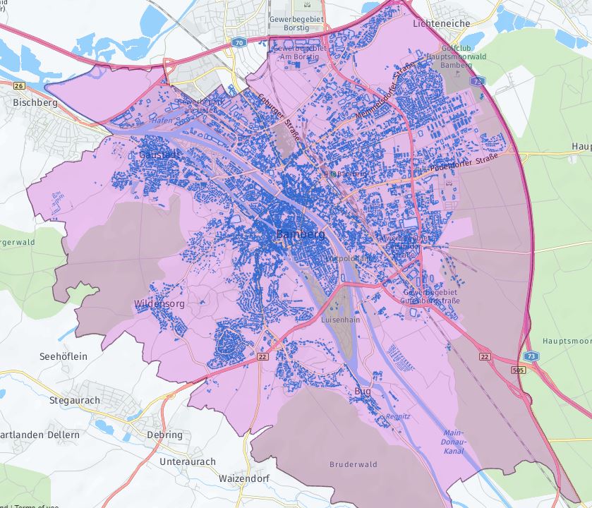 Seht selbst und schaut Euch in den folgenden Karten die drei bayrischen Städte mit den neuen Gebäude-Polygonen an (in blau), die in nur drei Monaten von unserer Community eingegeben wurden: