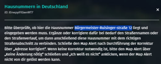 - Noch ein Hinweis zur Darstellung: In der Liste der Map Alerts wird ein Straßenname angegeben, den das System als den am nächsten liegenden identifiziert hat. Das ist allerdings nicht unbedingt auch der Name der gesuchten Straße mit der (neuen) Hausnummer. Diese Informationen zu Straßennamen und Hausnummern findet ihr alle in der Beschreibung des Map Alerts selber. Hier ein Beispiel: