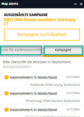 - Wenn ihr die Kampagne im Map Creator ausgewählt habt, könnt ihr entweder die Liste der Map Alerts auf der rechten Seite durchgehen (Überschrift „Kampagne“) oder ihr zoomt euch in das Gebiet eurer Wahl und ruft dort über „Liste für Kartenausschnitt“ die dort liegenden Alerts auf.